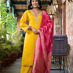 Mustard Zari Embroidered Viscose Kurta Pant And Dupatta Set With Mirror Work