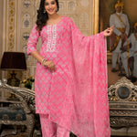 Juniper Pink Ethnic Motif Printed Cotton Kurta, Pant And Dupatta Set With Thread And Mirror Work
