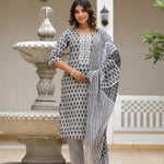 Juniper Grey Ethnic Motif Printed Cotton Kurta, Pant And Dupatta Set With Thread & Mirror Work
