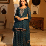 The Swarn Teal Ethnic Motif Printed Georgette Kurta Pant And Dupatta With Sequins & Zari Work