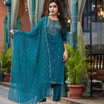 Blue Ethnic Motif Printed Muslin Kurta Set With Zari Work & Gota Patti
