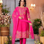 Pink Thread Embroidered Liva Rayon Kurta Pant And Dupatta Set With Sequins Beads & Lace