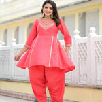 Peach Solid Viscose Kurta & Pant Set With Zari & Mirror Work