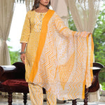 Mustard Ethnic Motif Printed Cotton Kurta, Pant And Dupatta Set With Lace & Buttons