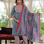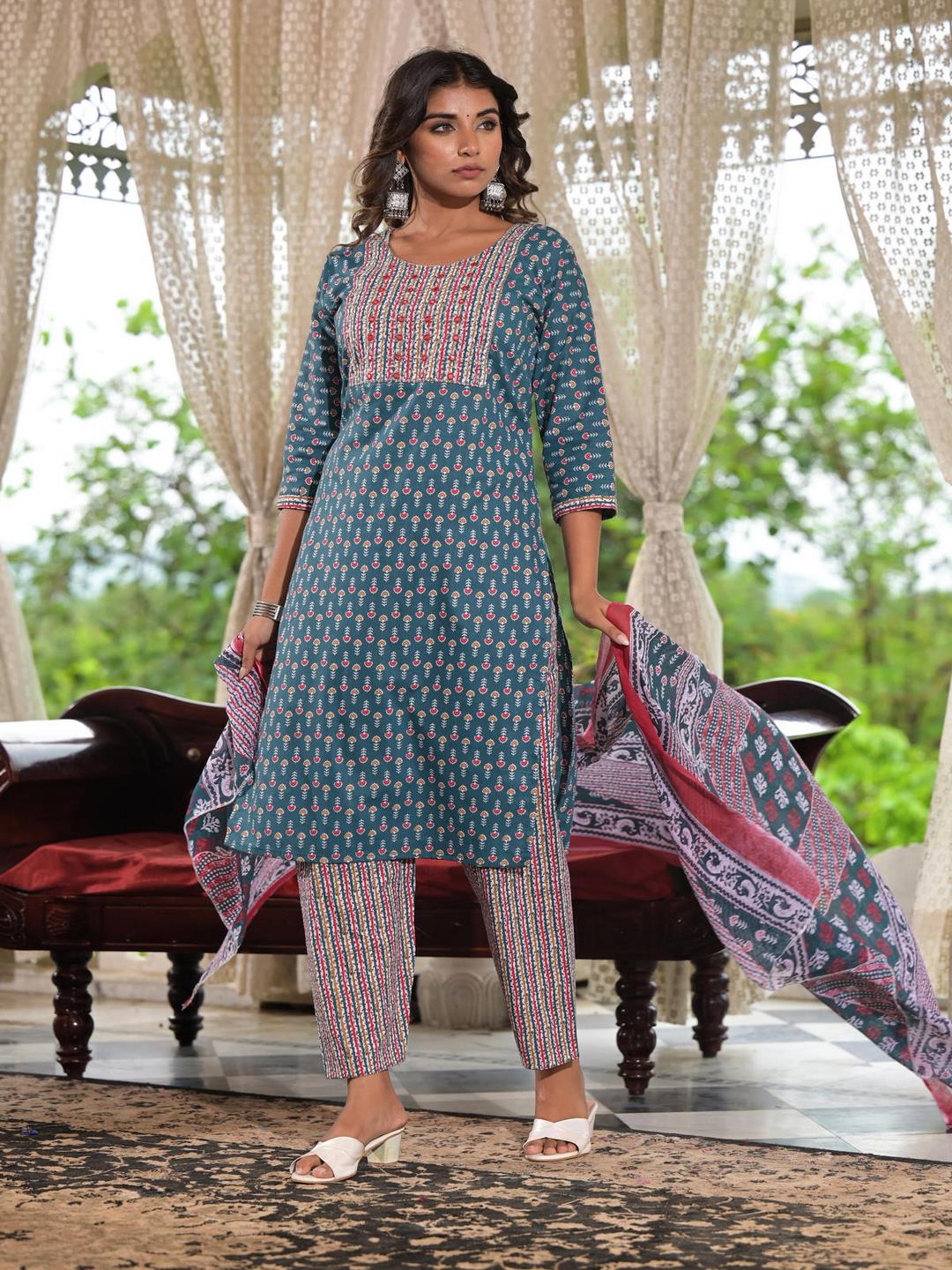 Teal Blue Ethnic Motif Printed Cotton Kurta, Pant And Dupatta Set With Zari & Thread Work