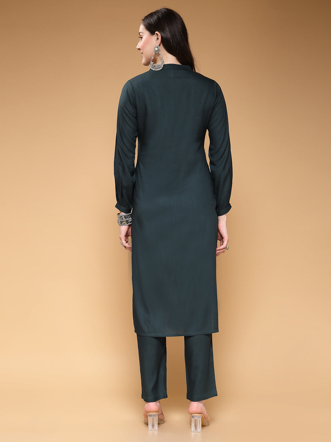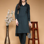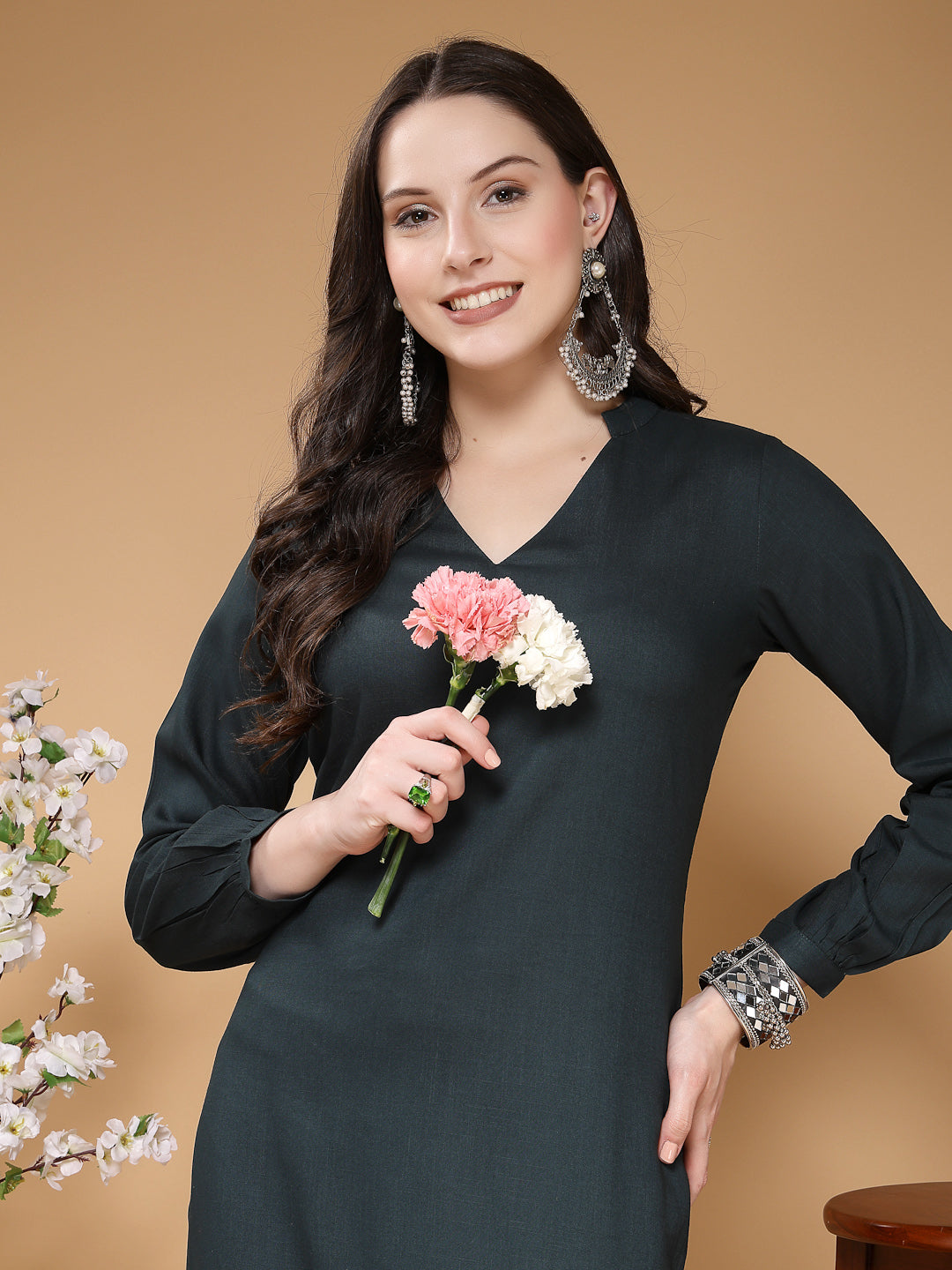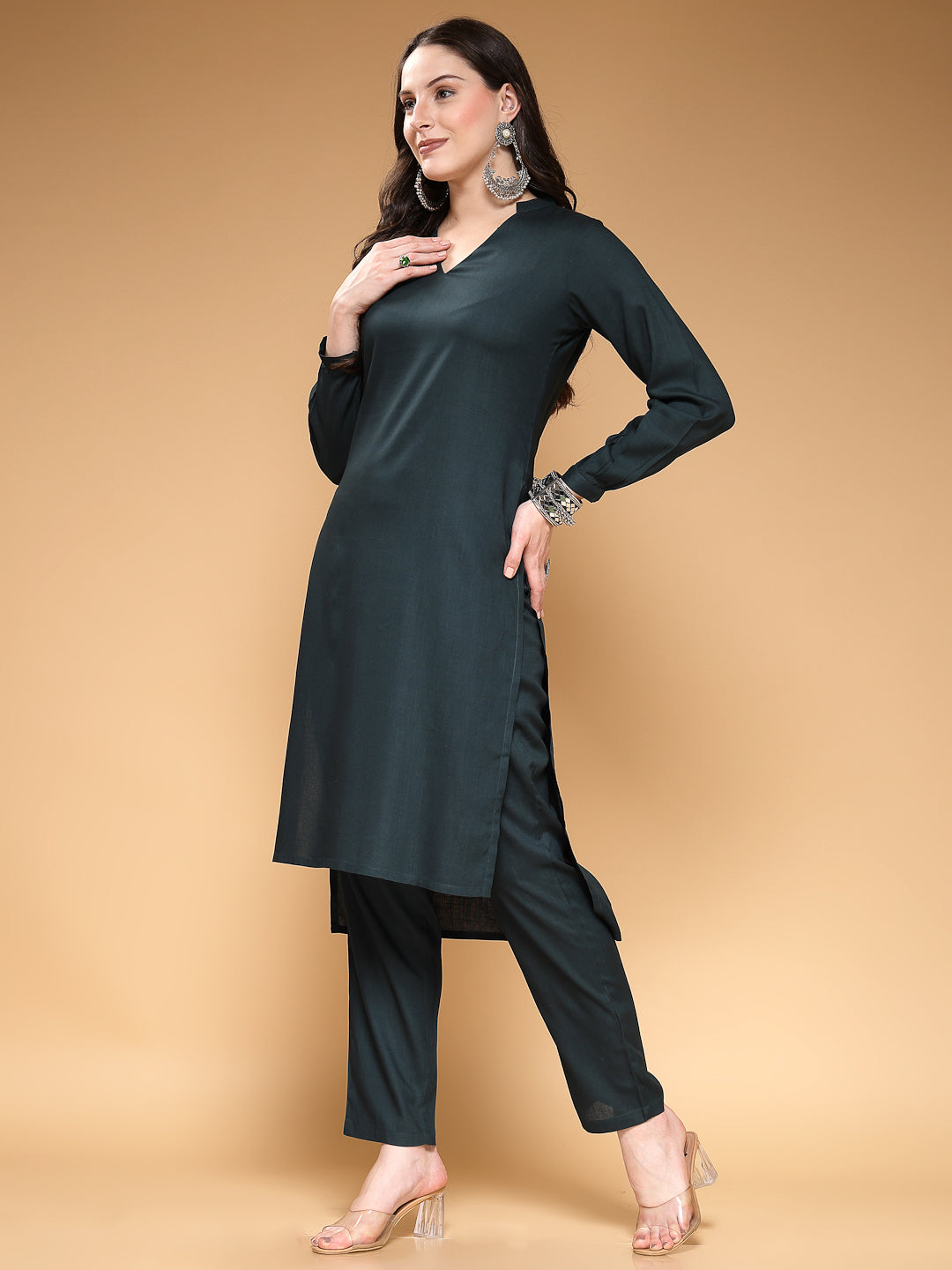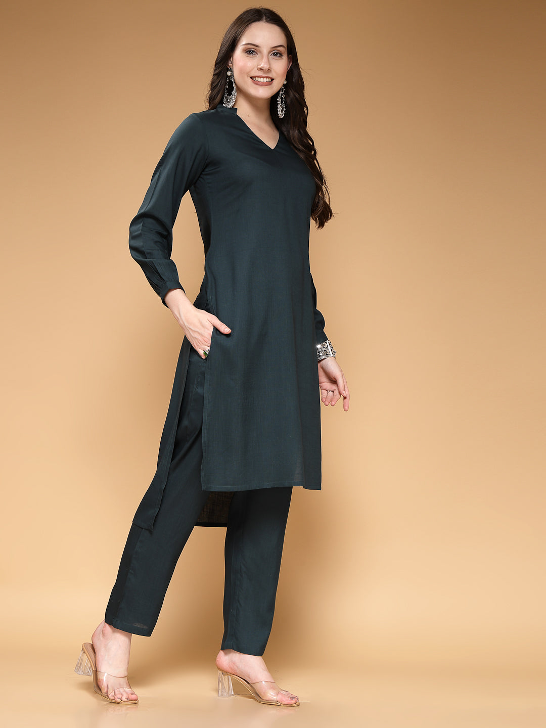 Solid V-Neck 3/4 Sleeves Calf Length Rayon Kurta Set