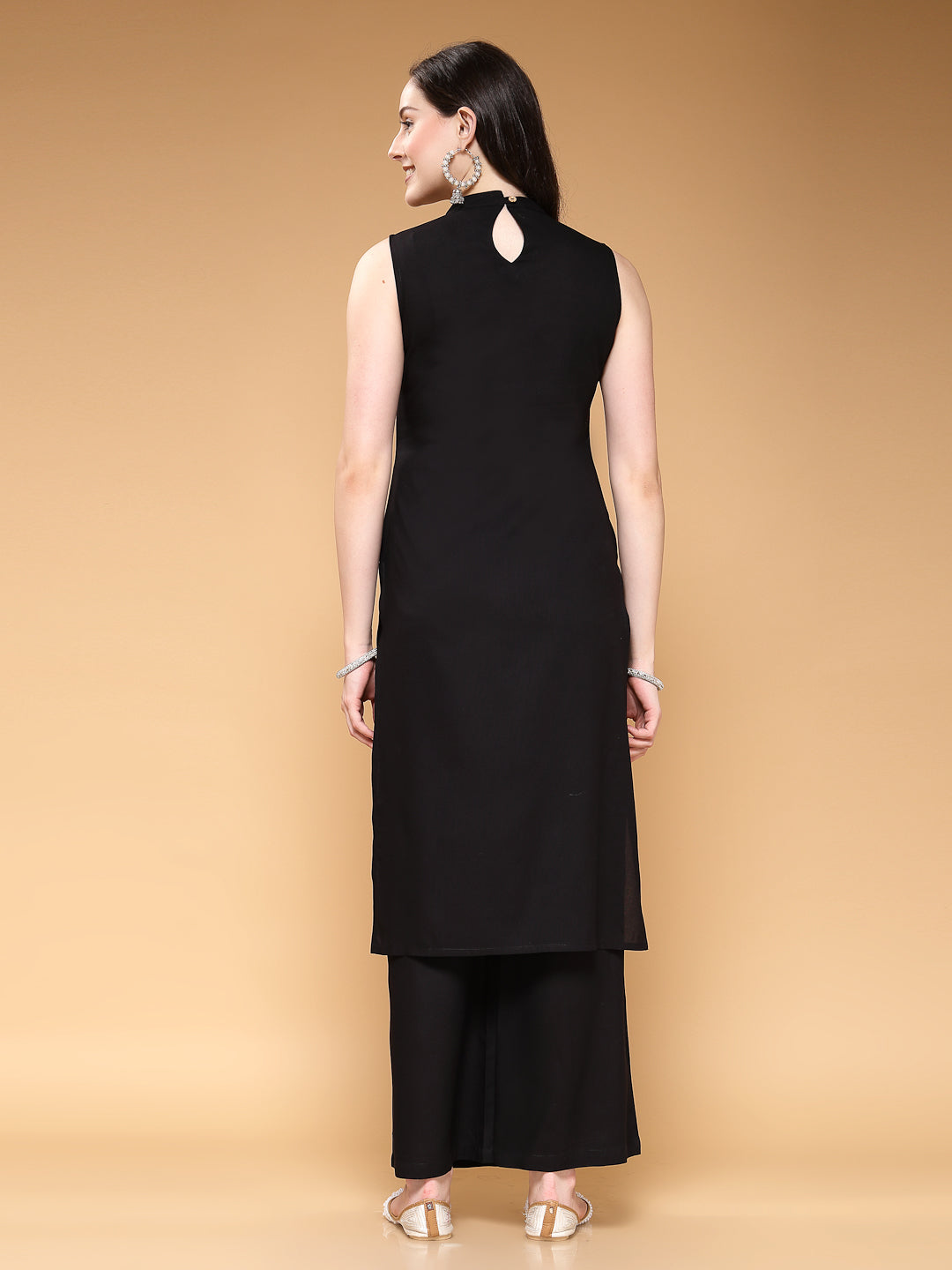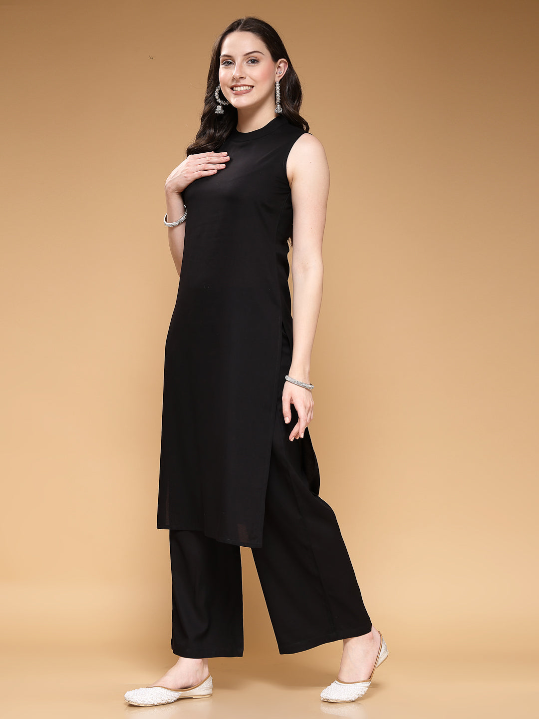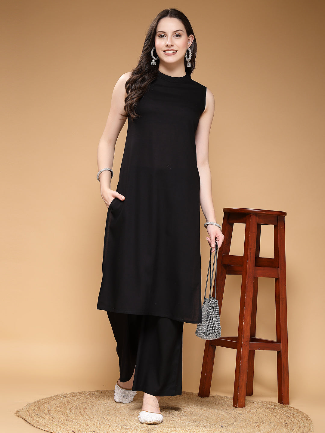 Solid Round Neck Sleeveless Calf Length Rayon Kurta Set