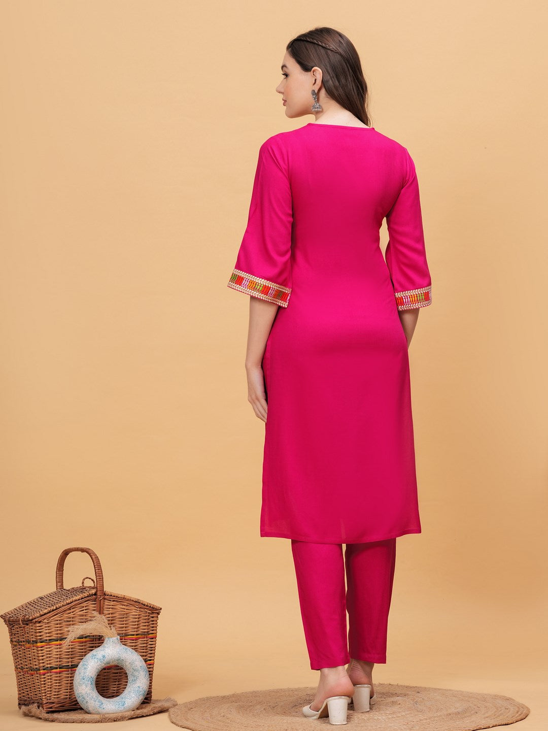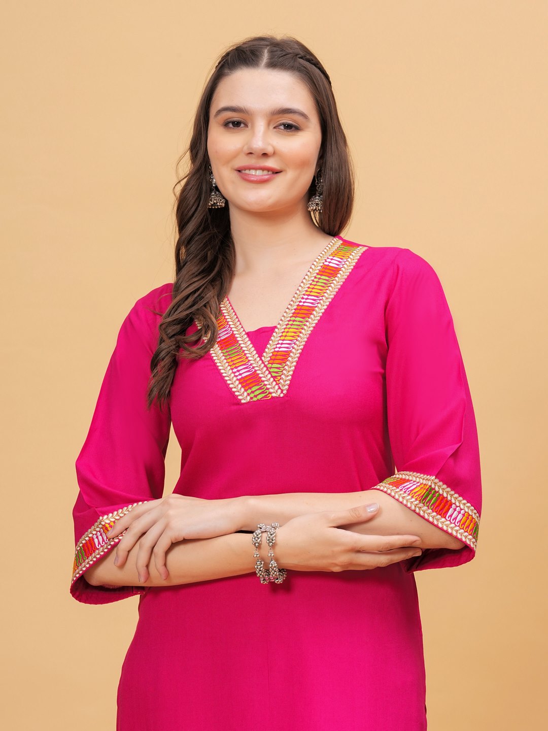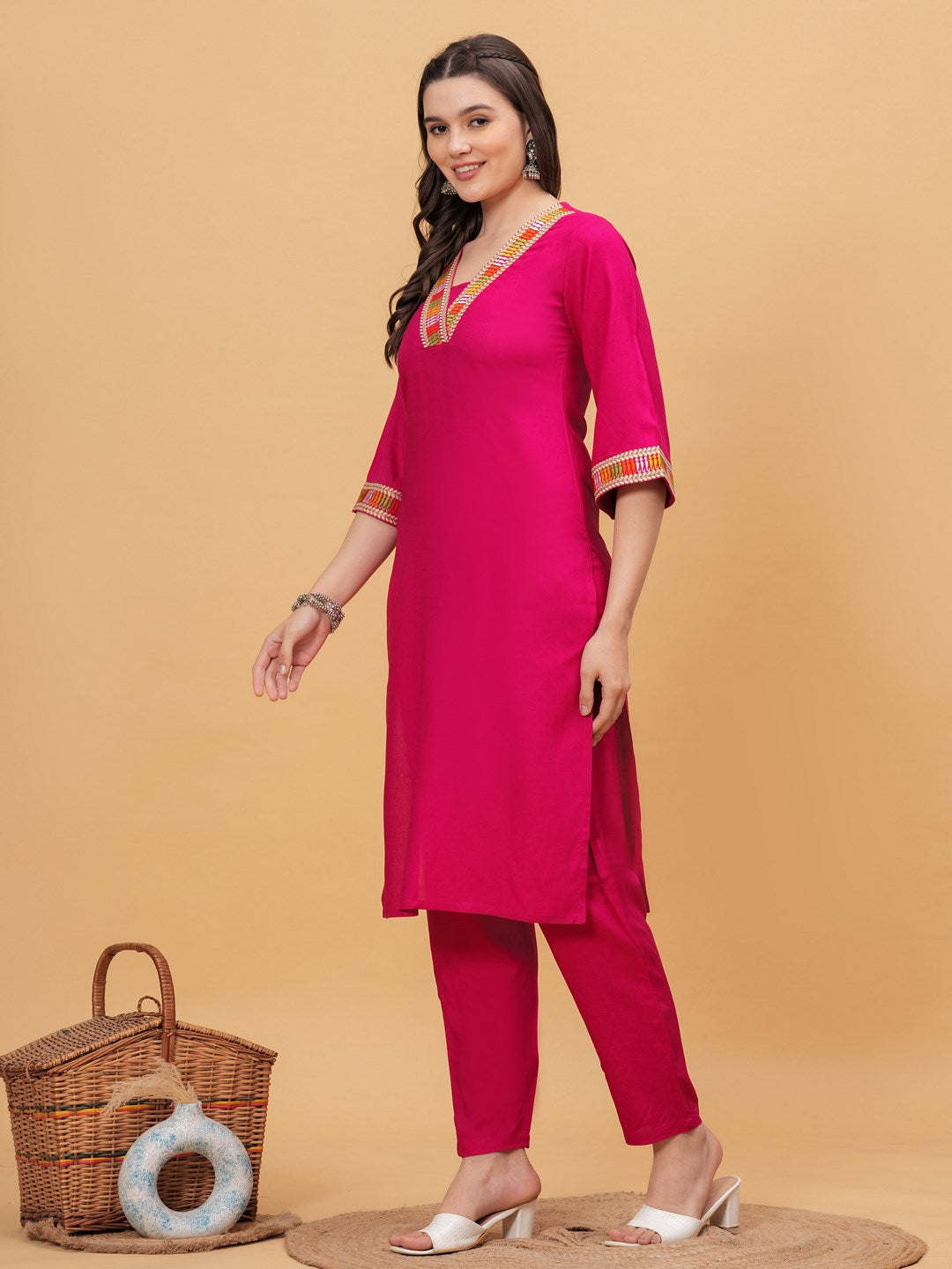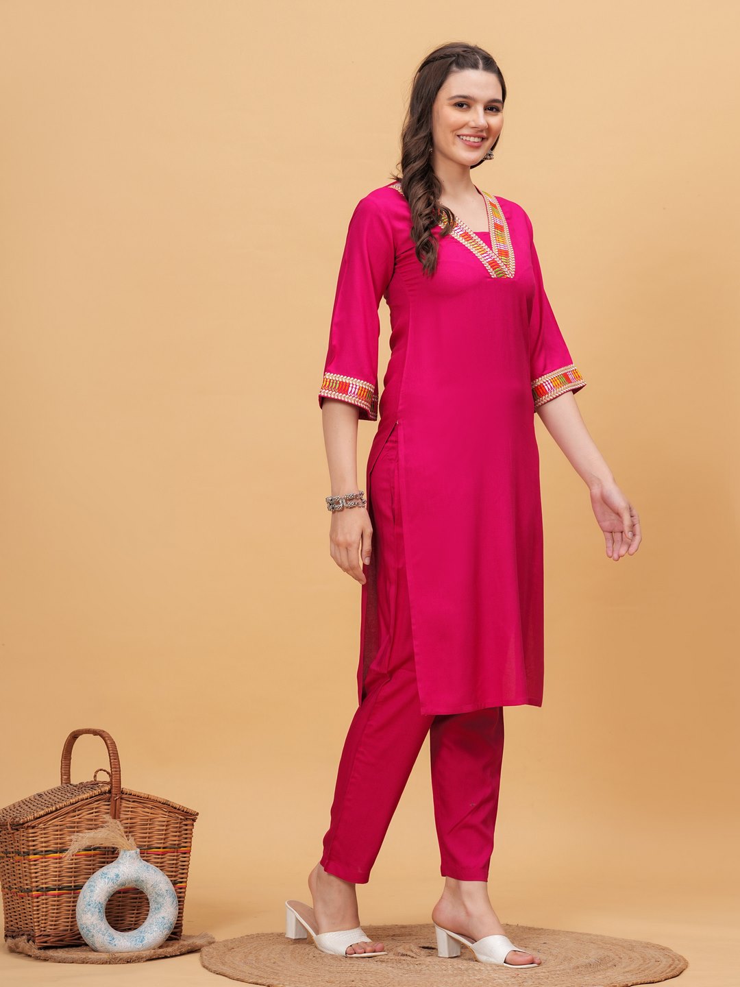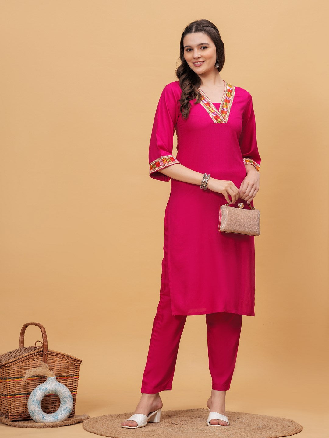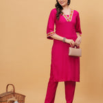 Solid V-Neck 3/4 Sleeves Calf Length Rayon Kurta Set
