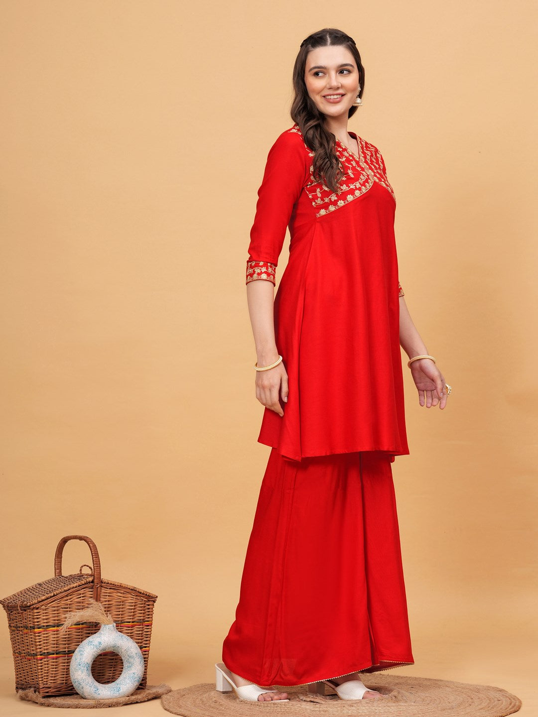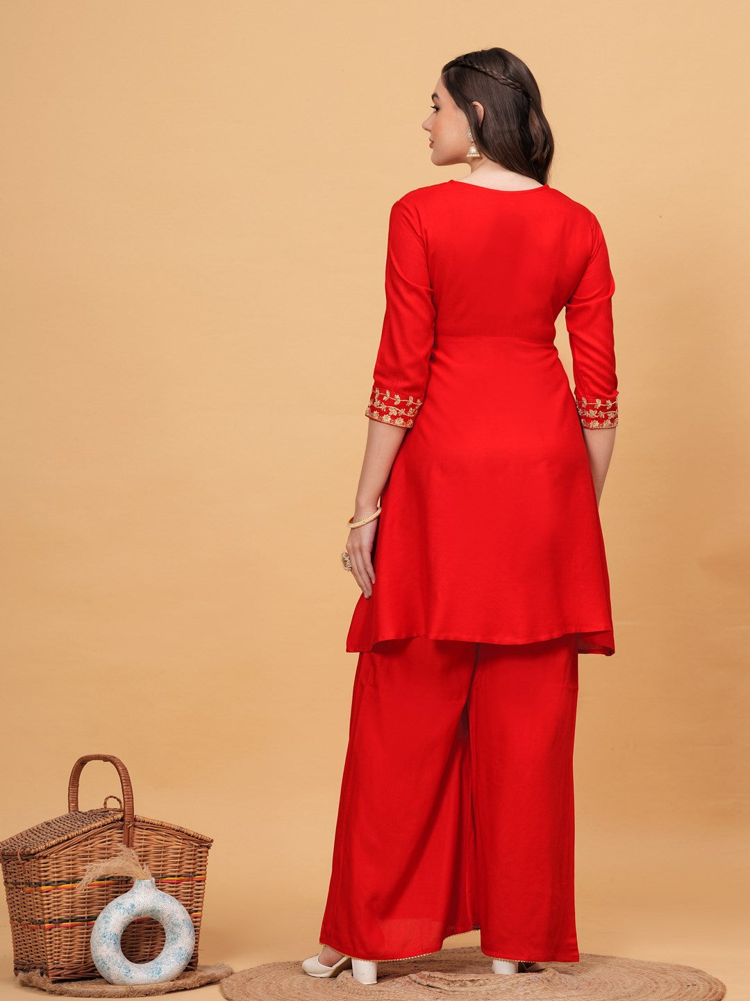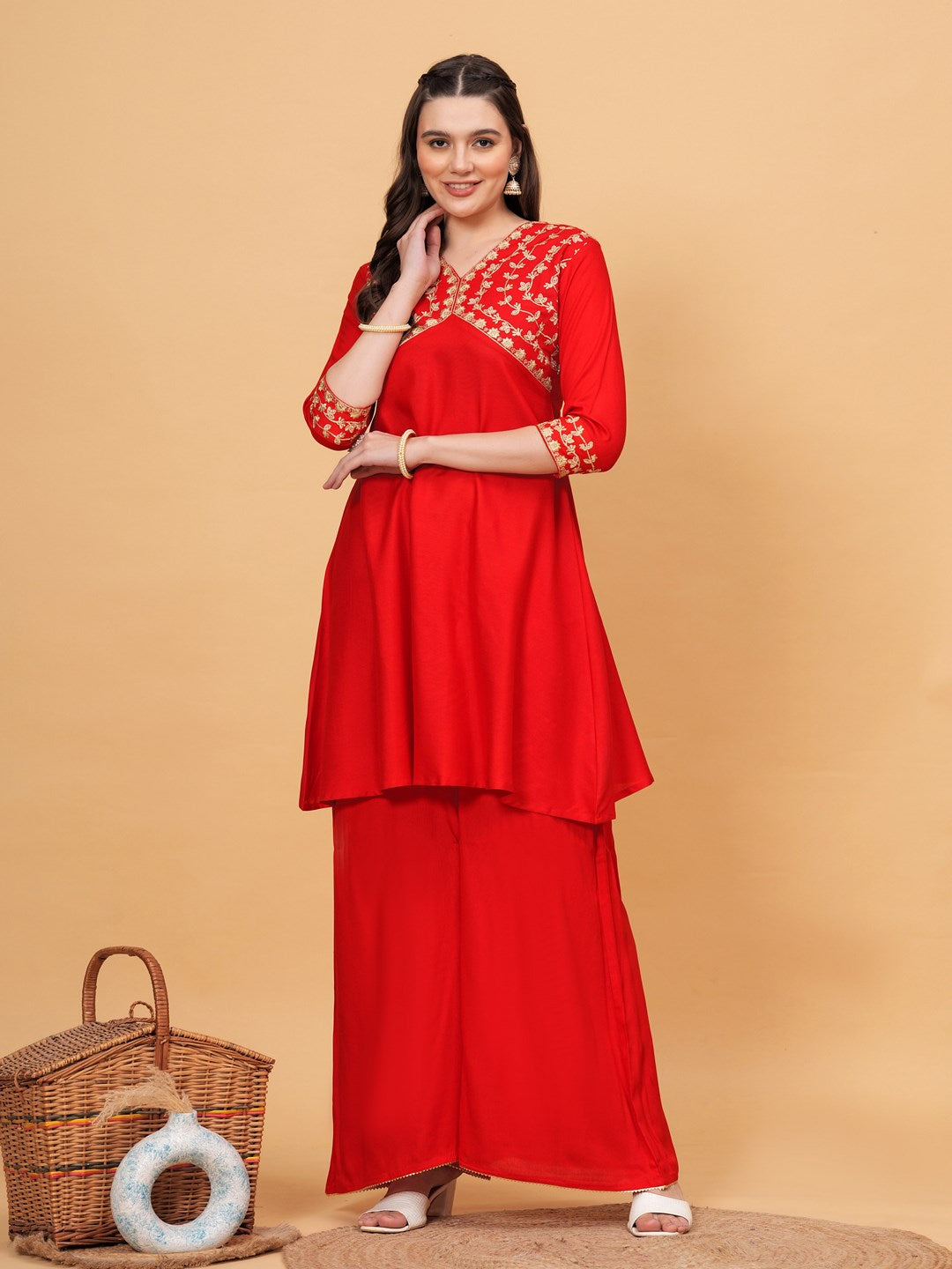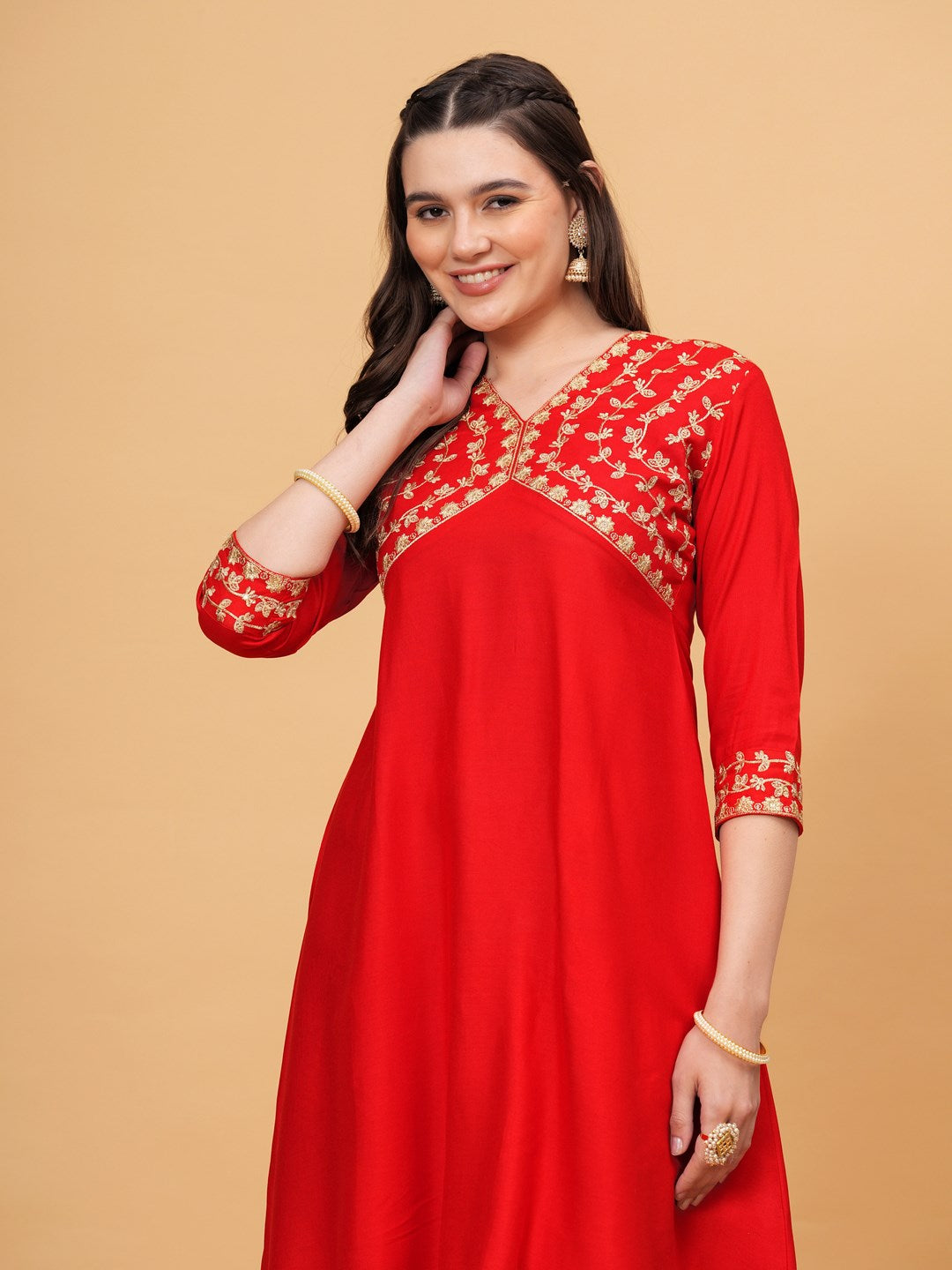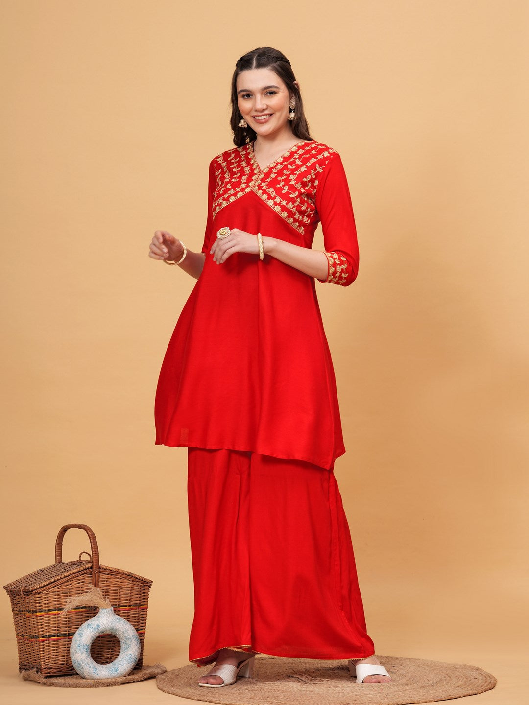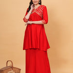 Solid V-Neck 3/4 Sleeves knee Length Rayon Kurta Set