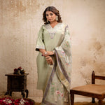 Embroidered Solid V-Neck Muslin Kurta & Pant With Dupatta