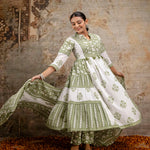 Green Printed Round Neck Calf Length Cotton Kurta & Pant With Dupatta