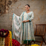 Green Printed V-Neck Calf Length Silk Kurta & Pant With Dupatta