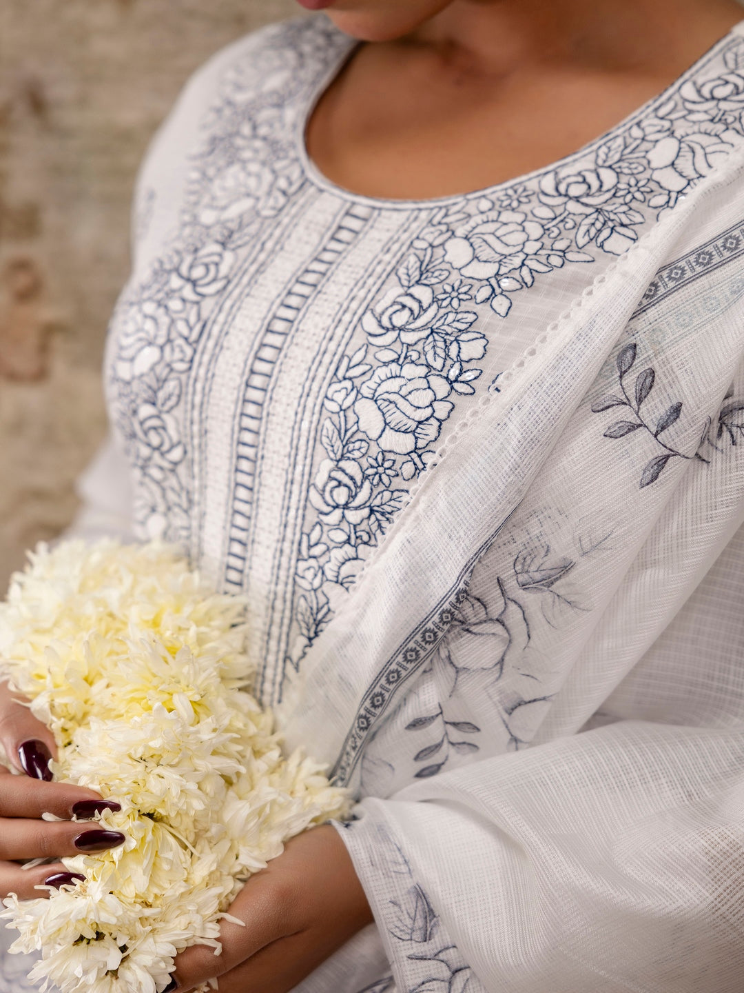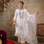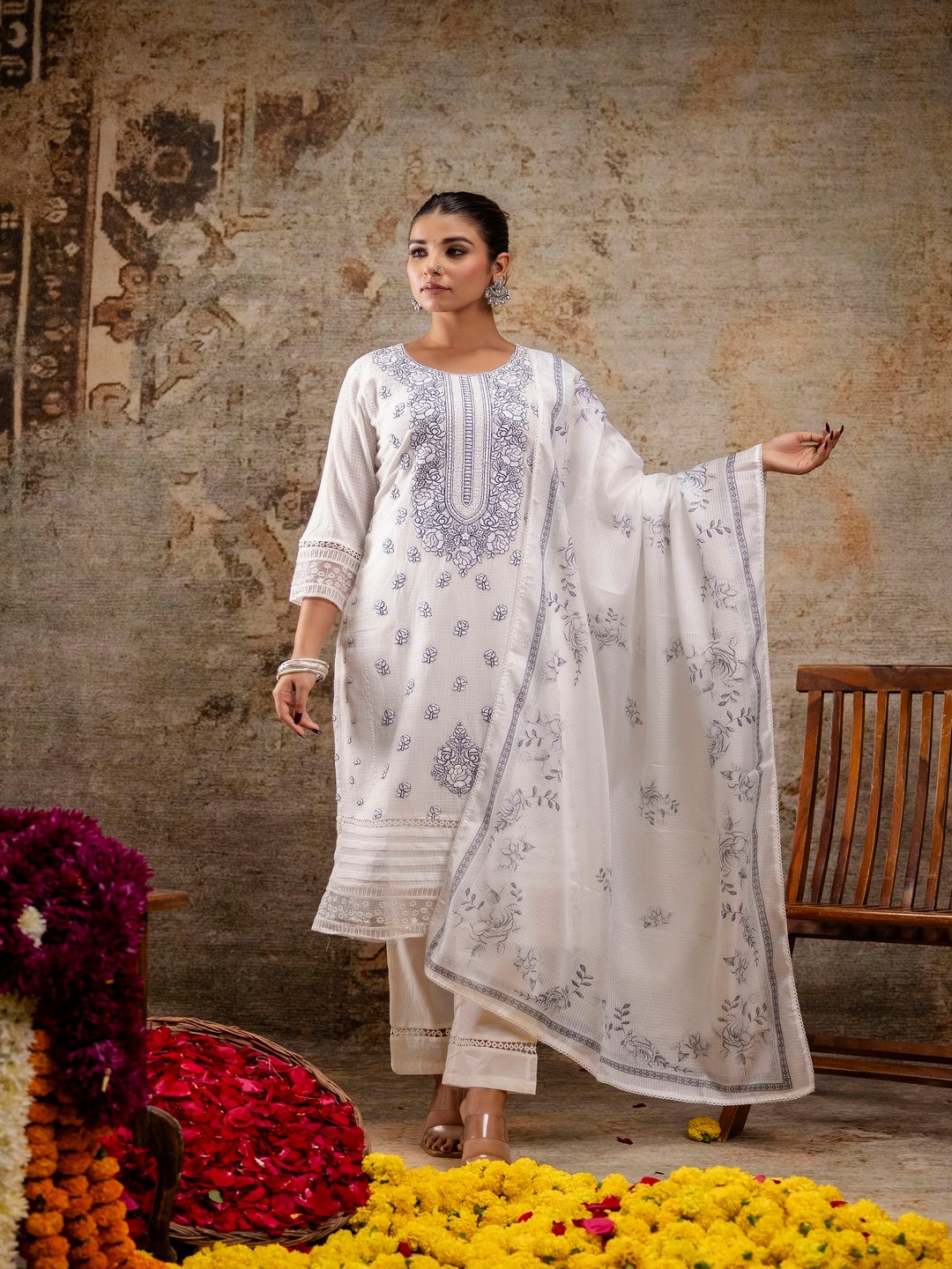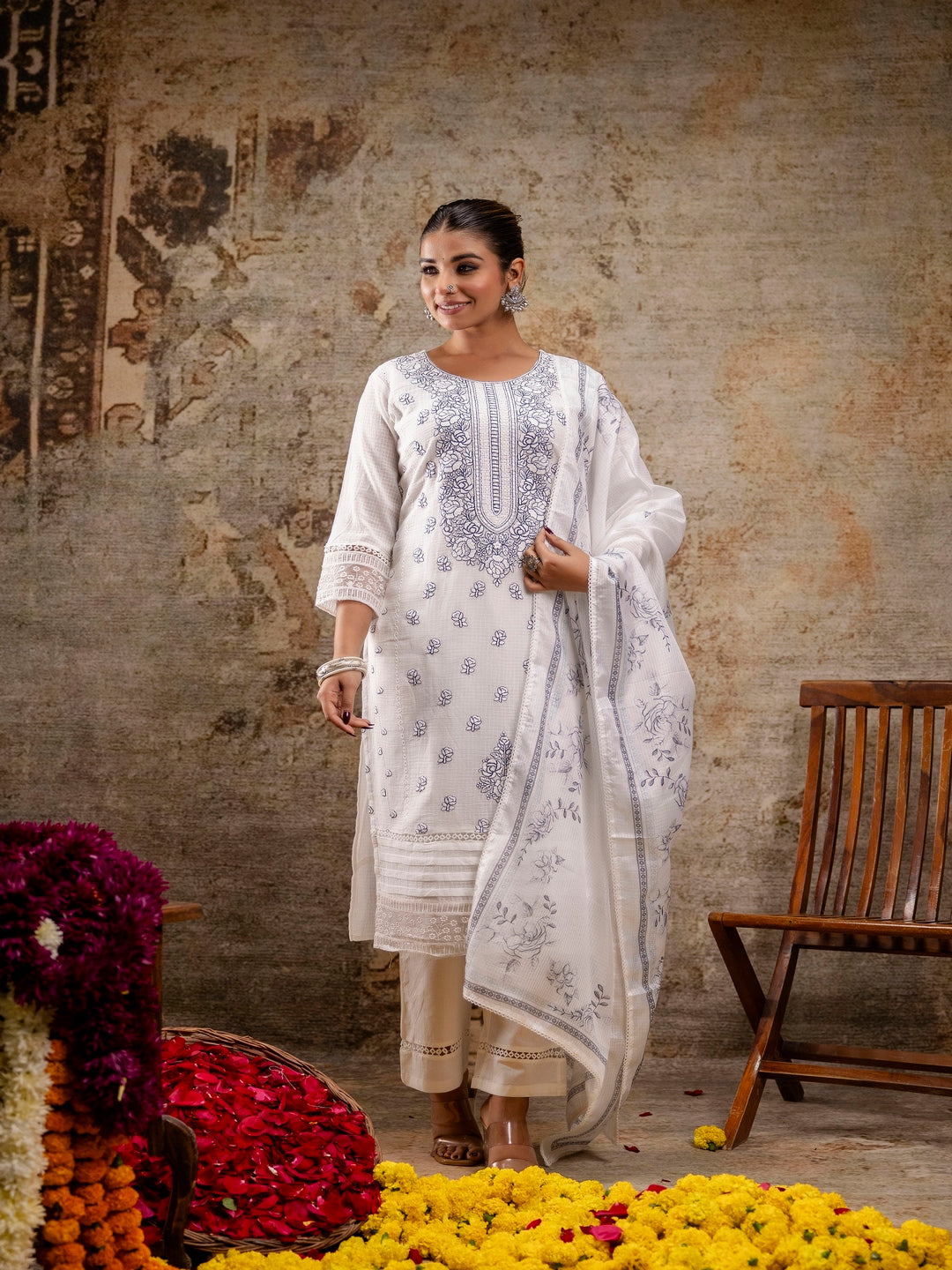 White Blue Embroidered Round Neck Calf Length Cotton Blend Kurta & Pant With Dupatta