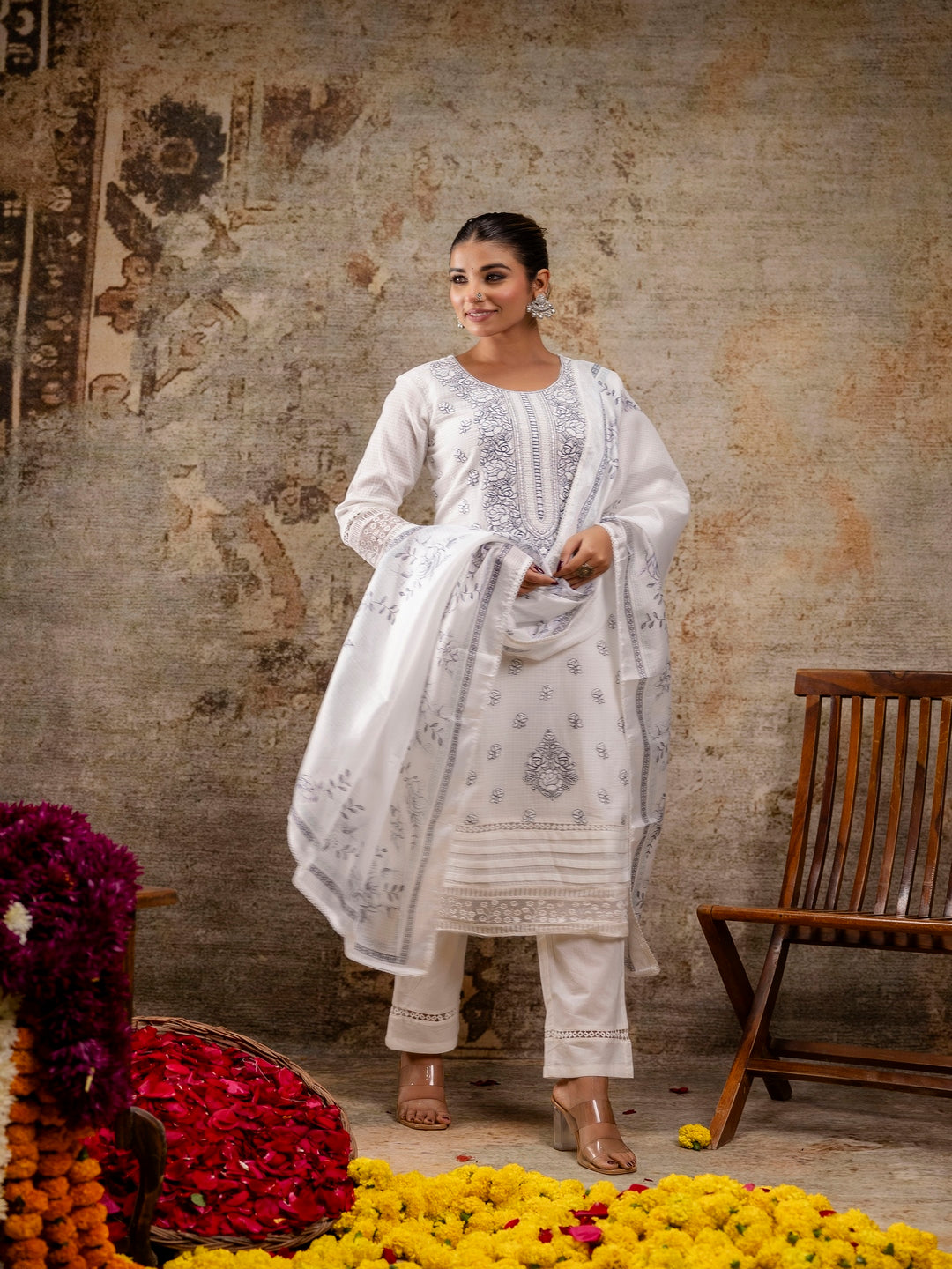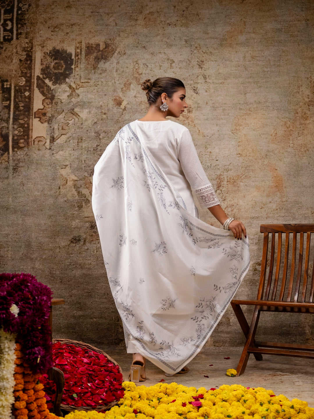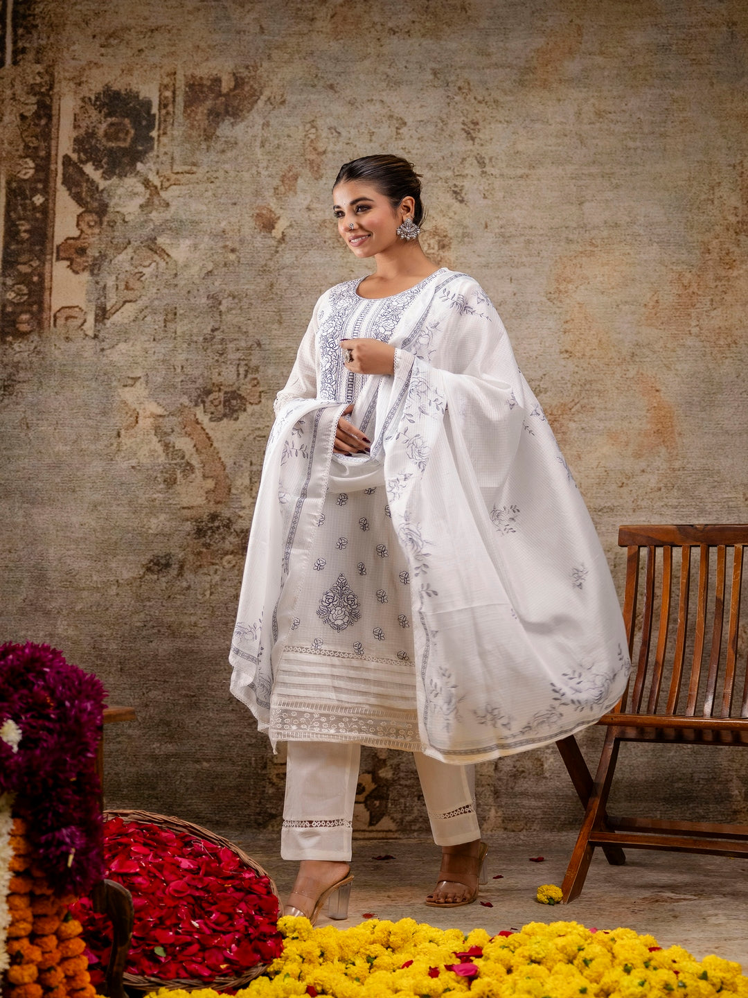 White Blue Embroidered Round Neck Calf Length Cotton Blend Kurta & Pant With Dupatta