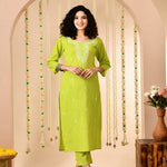 Lime Green Embroidered Kurti Pant Set With Square Neck