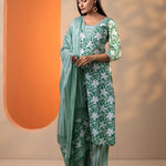 Green Floral Printed Cotton Straight Kurta Set With Striped Dupatta