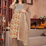Floral Print Cotton Kurta Set With Dupatta White & Multicolor