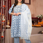 Sky Blue & White Printed Cotton Straight Kurta Set With Dupatta