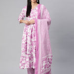 Description - Flared Style Cotton Fabric Pink Color Floral Printed Kurti With Bottom And Dupatta With Mirror Work