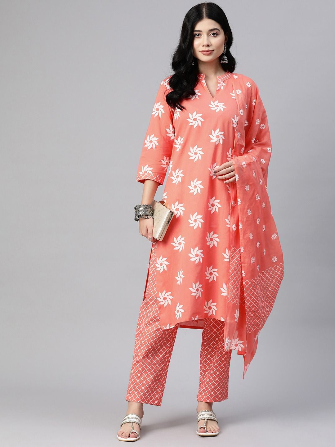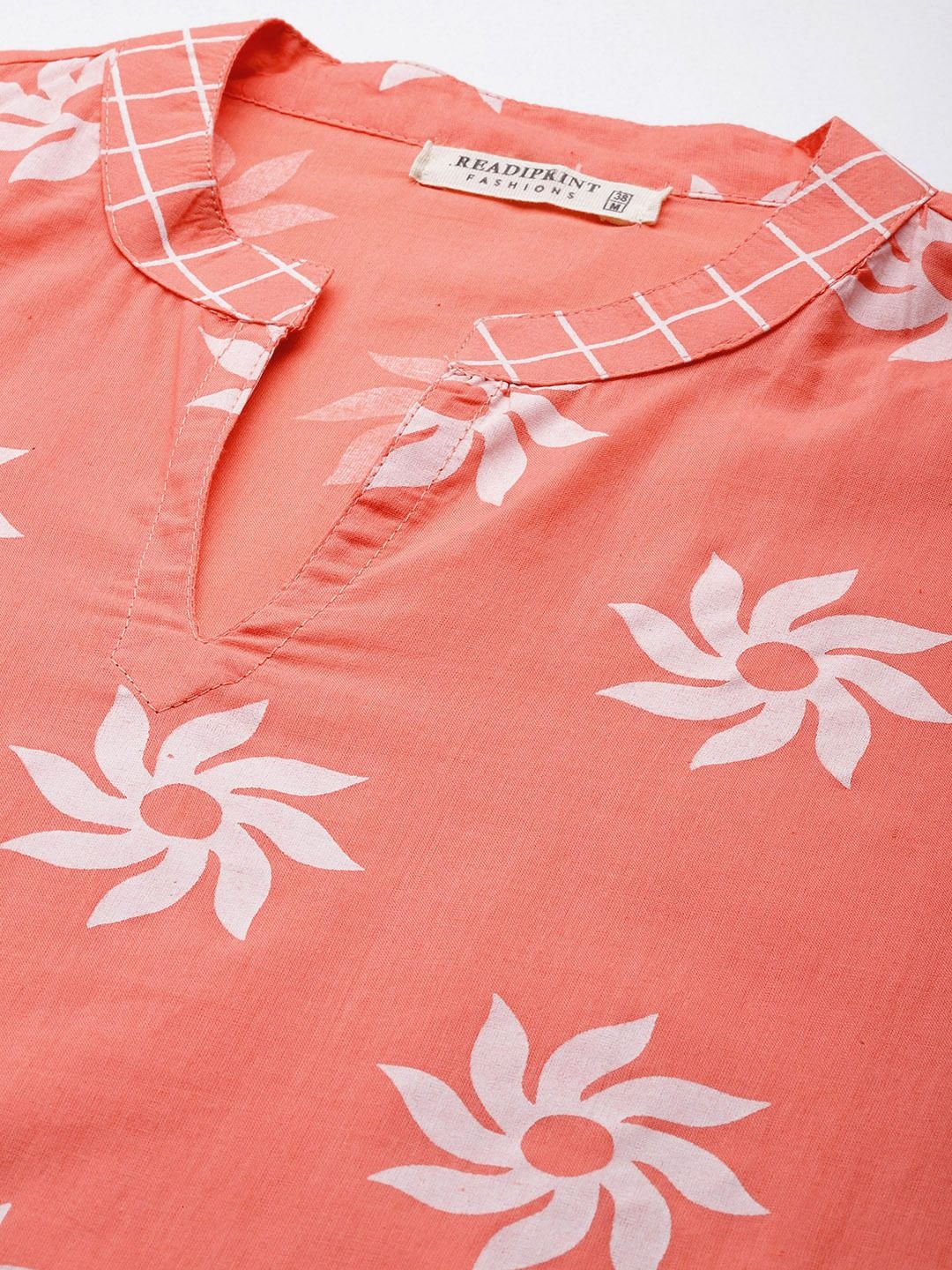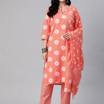 Description - Straight Style Cotton Fabric Orange Color Printed Kurti With Bottom & Dupatta