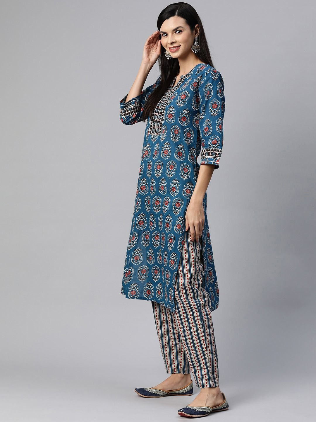 Description - Straight Style Cotton Fabric Navy Blue Color Printed Kurti With Bottom & Dupatta
