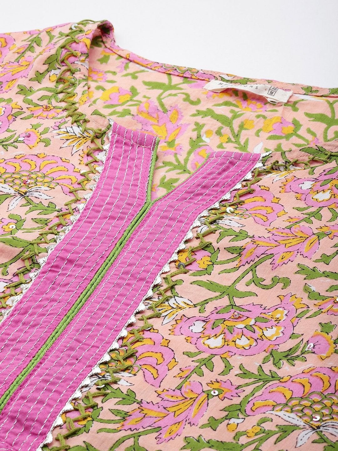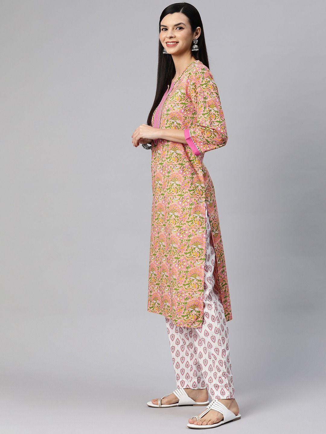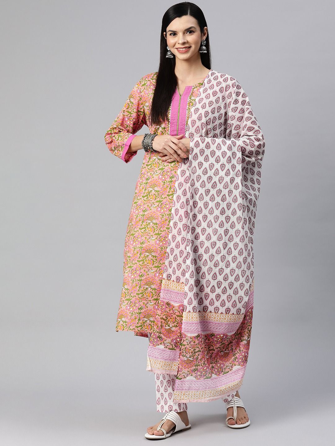 Description - Straight Style Cotton Fabric Orange Color Printed Kurti With Bottom & Dupatta