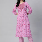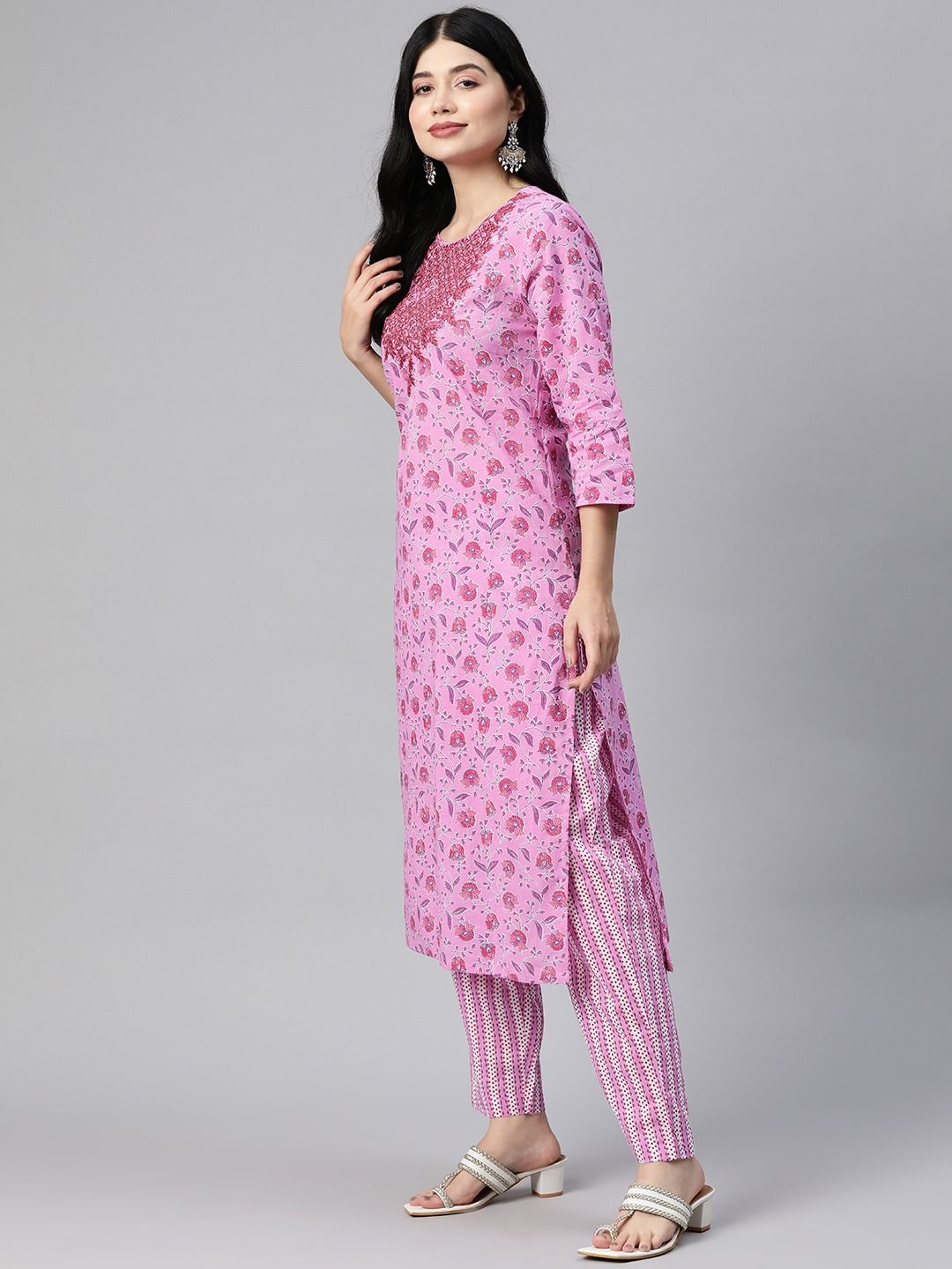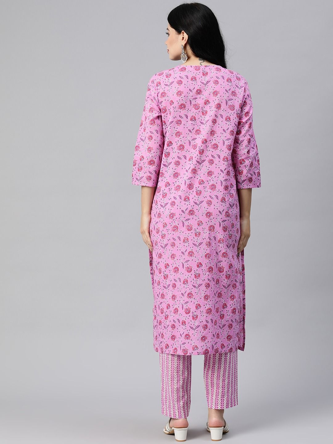 Description - Straight Style Cotton Fabric Purple Color Floral Printed Kurti And Bottom With Thread Work