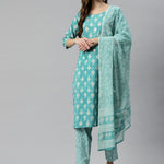 Straight Style Cotton Fabric Green Color Kurta And Bottom With Dupatta