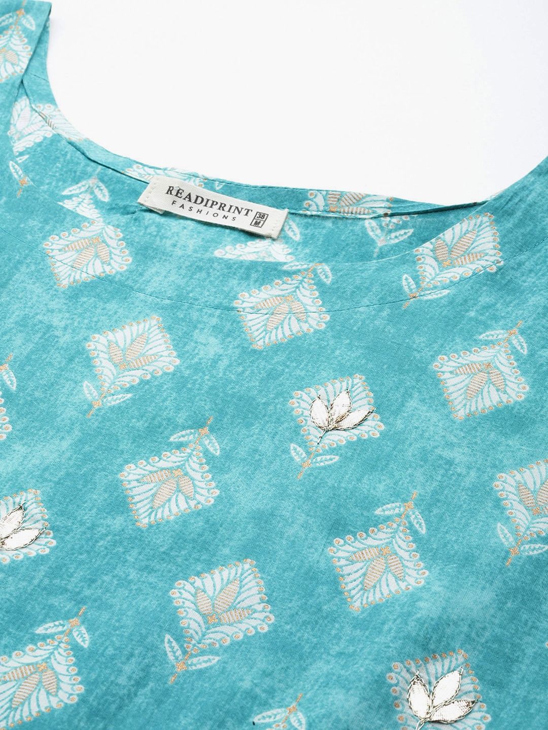 Description - Straight Style Cotton Fabric Green Color Printed Kurta With Bottom And Dupatta With Gotta Work