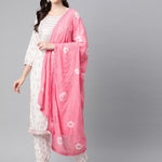 Description - Straight Style Cotton Fabric Pink & White Color Kurti With Thread & Sequence Work With Bottom & Dupatta