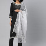 Straight Style Rayon Fabric Black & White Color Kurta With Bottom & Dupatta