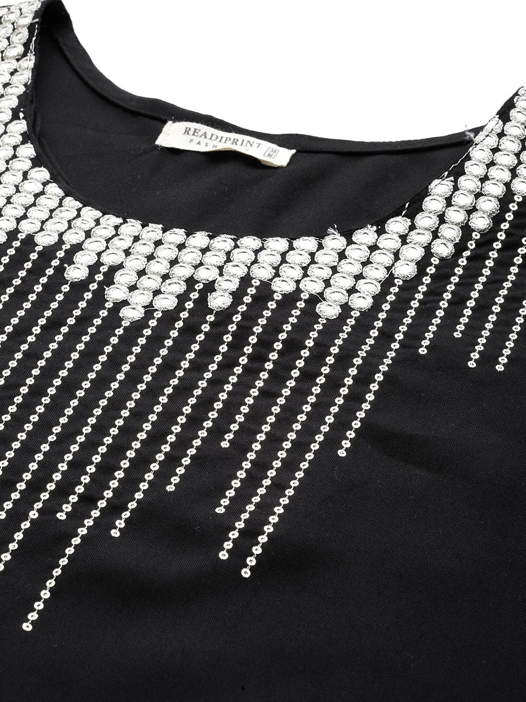 Description - Straight Style Rayon Fabric Black & White Color Kurti With Mirror & Zari Work With Bottom & Dupatta