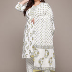 Straight Style Cotton Fabric Green & White Color Kurta With Bottom & Dupatta
