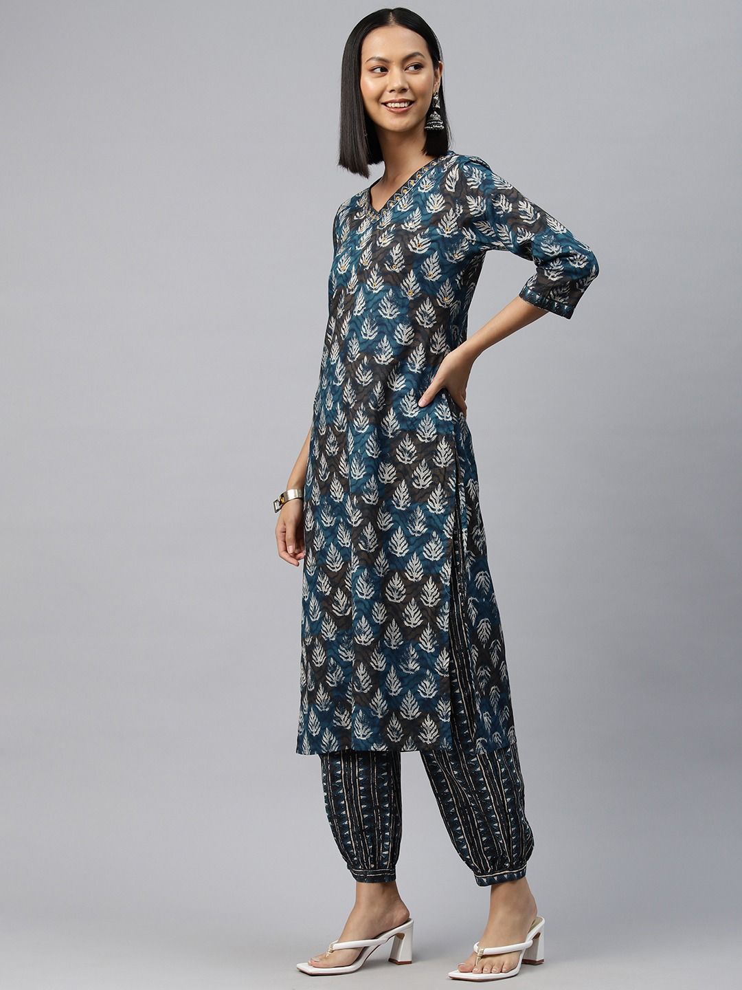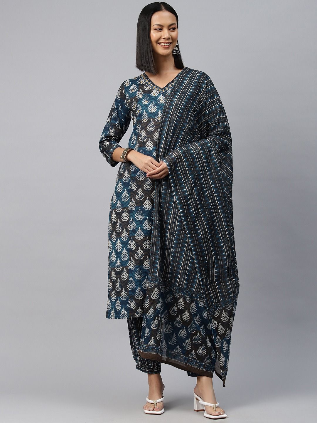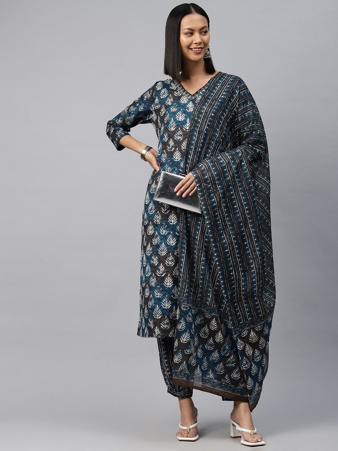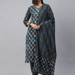 Straight Style Cotton Fabric Navy Blue Bottom & Dupatta