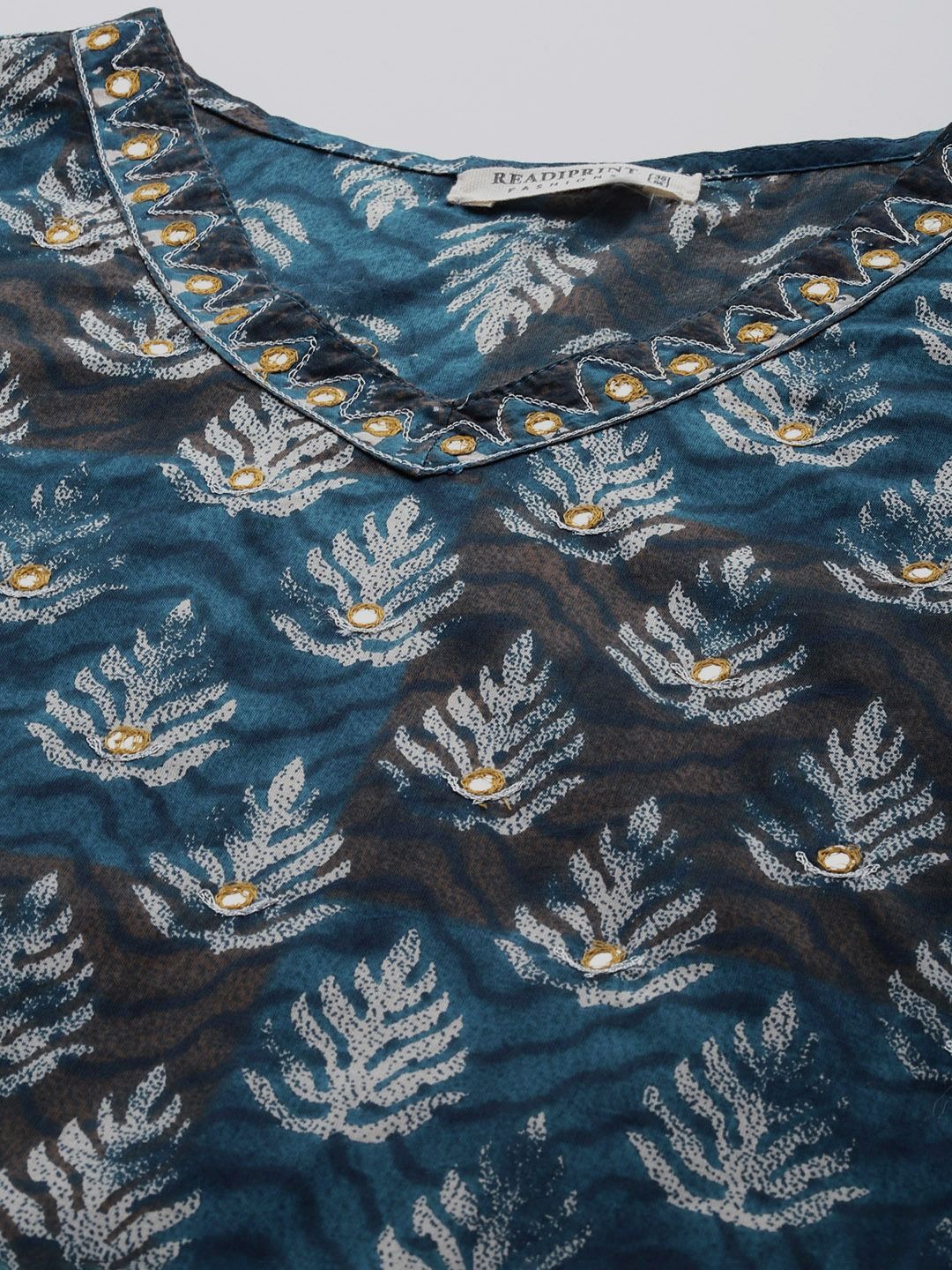 Description - Straight Style Cotton Fabric Navy Blue Color Kurti With Zari & Mirror Work With Bottom & Dupatta