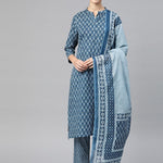 Straight Style Cotton Fabric Navy Blue Color Kurta With Bottom & Dupatta
