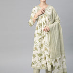 Flared Style Cotton Fabric Green & Cream Color Kurta With Bottom & Dupatta