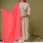 Flared Style Cotton Fabric Cream Color Kurta With Palazzo & Dupatta