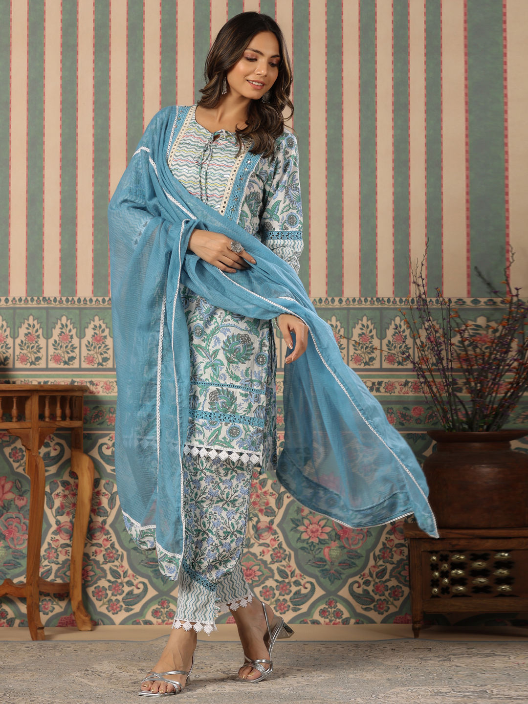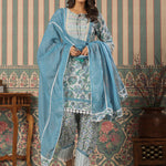 Straight Style Cotton Fabric Blue Color Kurta With Bottom & Dupatta