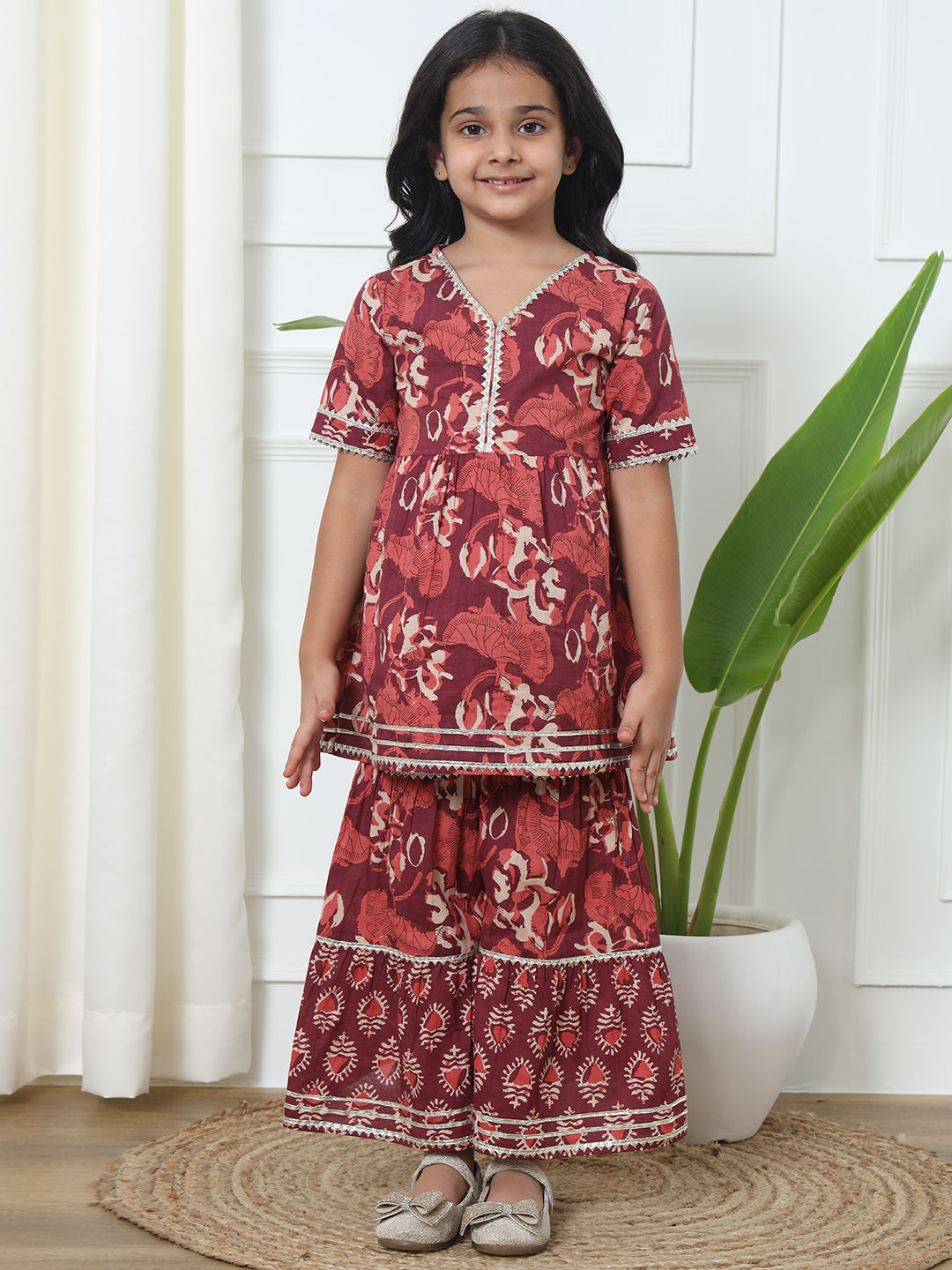 Description - Girls Frock Style Cotton Fabric Burgundy Color Floral Printed Kurti And Sharara With Gotta Lace Work