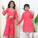 Description - Girls Straight Style Cotton Fabric Pink Color Bandhej Top And Sharara With Gotta Lace Work
