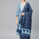 Straight Style Cotton Fabric Navy Blue Color Kurta And Palazzo With Dupatta