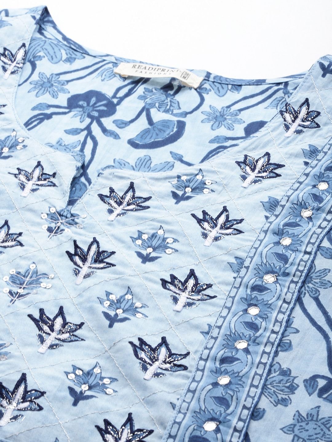 Description - Straight Style Cotton Fabric Navy Blue Color Floral Printed Kurti With Sequence, Thread And Zari Work With Palazzo & Dupatta