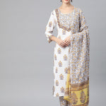 Straight Style Cotton Fabric White & Grey Color Kurta And Palazzo With Dupatta