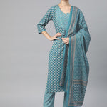 Straight Style Cotton Fabric Blue Color Kurta And Palazzo With Dupatta