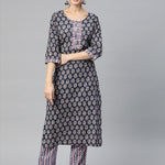 Description - Straight Style Cotton Fabric Navy Blue Color Floral Printed Kurti With Thread And Zari Work With Palazzo