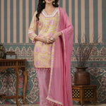 Straight Style Cotton Fabric Yellow Color Kurti With Bottom & Dupatta