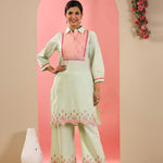 Description - Straight Style Cotton Fabric Green Color Kurti And Straight Palazzo With Thread Embroidery