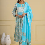 Flared Style Cotton Fabric Blue Color Kurti And Bottom With Dupatta