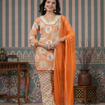 Straight Style Cotton Fabric Orange Color Kurti With Bottom & Dupatta